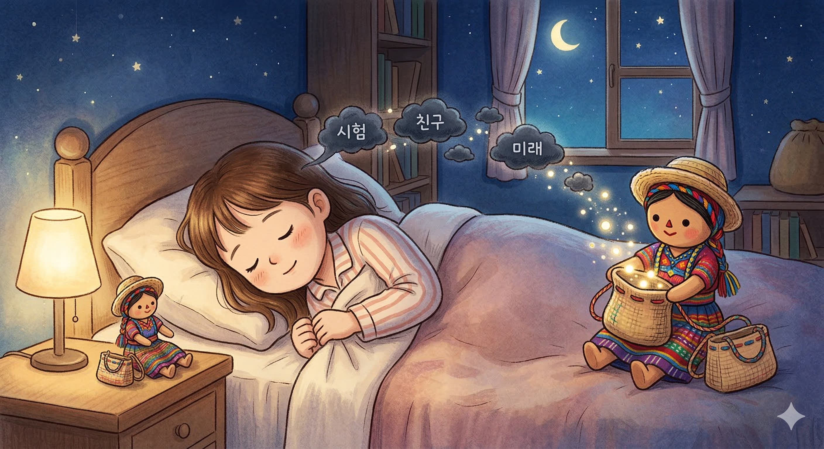 걱정인형(Muñeca Quitapena)은 과테말라 마야 원주민 문화에서 유래한 작은 천 인형입니다. 전통에 따르면 잠들기 전 베개 밑에 두고 자신의 걱정을 인형에게 털어놓으면, 인형이 밤새 대신 걱정해주어 편안한 잠을 잘 수 있다고 믿었습니다. 소박하고 단순한 믿음처럼 보이지만, 현대 심리학은 이 의식에서 놀랍도록 정교한 치유 메커니즘을 발견합니다.